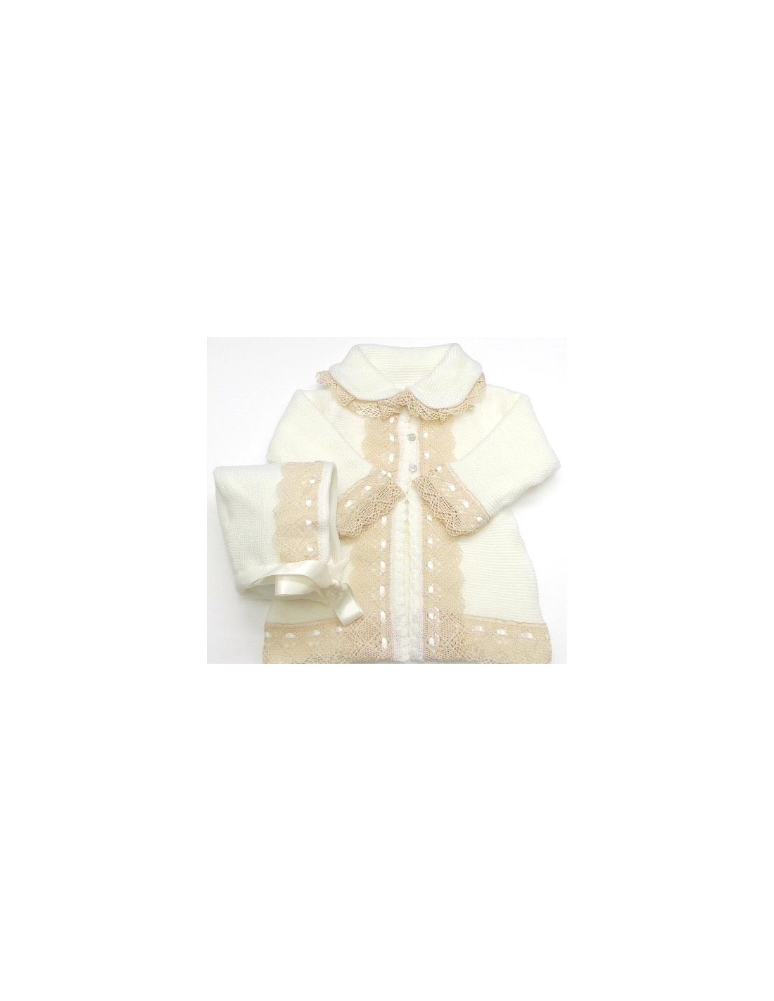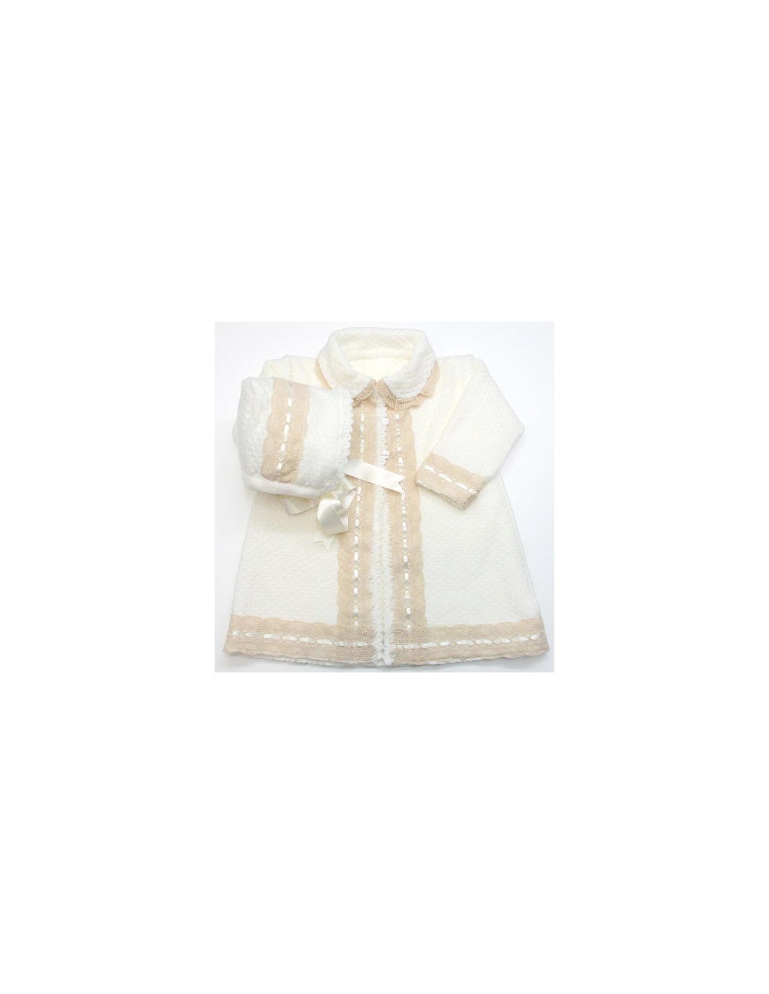 Abrigo de punto bobo y capota a juego, con encajes de puntilla en crudo.
