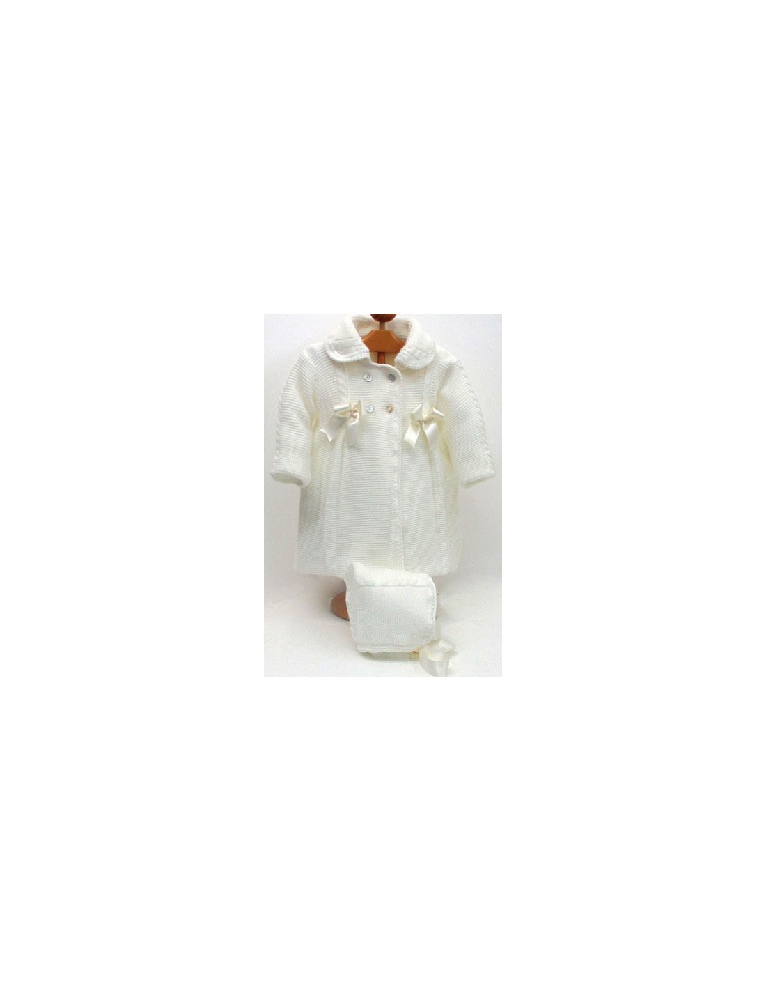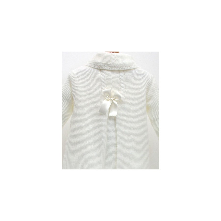 Abrigo con capota, de doble capa y de punto bobo, lleva dos pliegues en la pechera y uno en la parte posterior y con lazos en pechera y por detrás a juego,