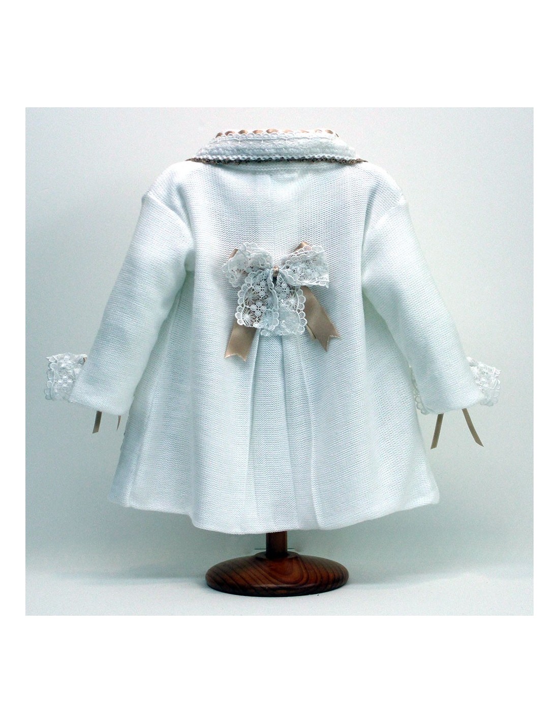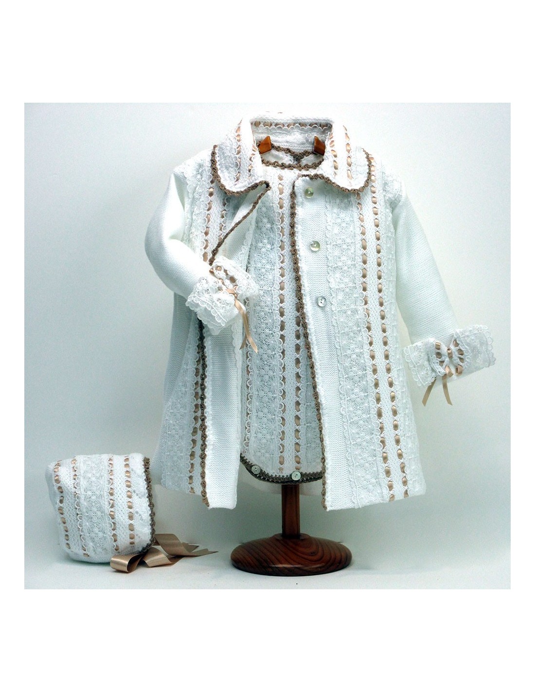Abrigo, pelele y capota con encajes de guipur, el tejido de punto y encajes en color blanco, lazos y terminaciones a ganchillo en color a elegir. Guia de tallas: T.1M para 4 kg// T.3M para 5,5kg// T.6M para 7 kg// T.9M para 8 kg// T.12M para 9,5kg// T.18M para 11 kg// T.24M para 12,5kg//