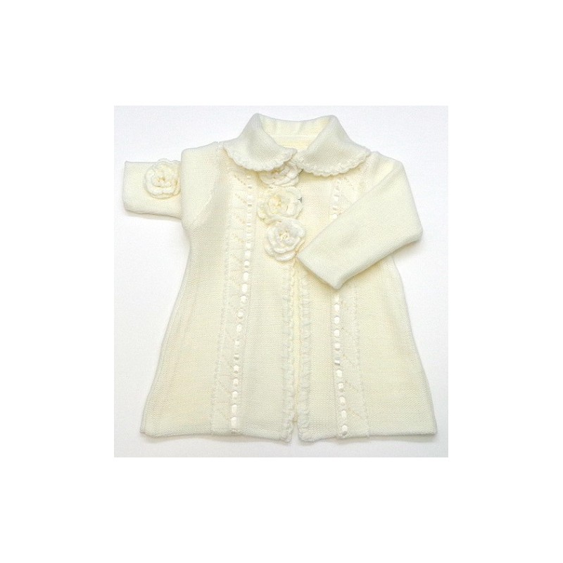 Abrigo lana doble capa, decoraciones al mismo tono y lazos entretejidos en crudo.