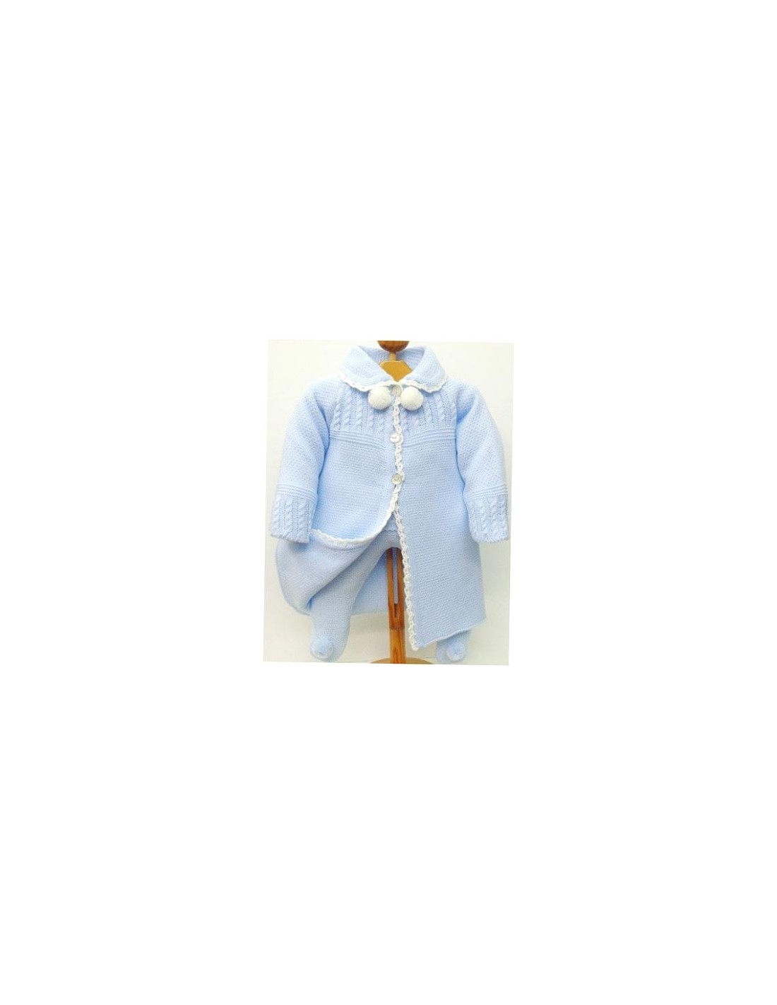 Abrigo con cuello y terminaciones de ochos en canesú y puños, terminado a ganchillo y pompones en colores blanco o crudo como segundo color al combinar.