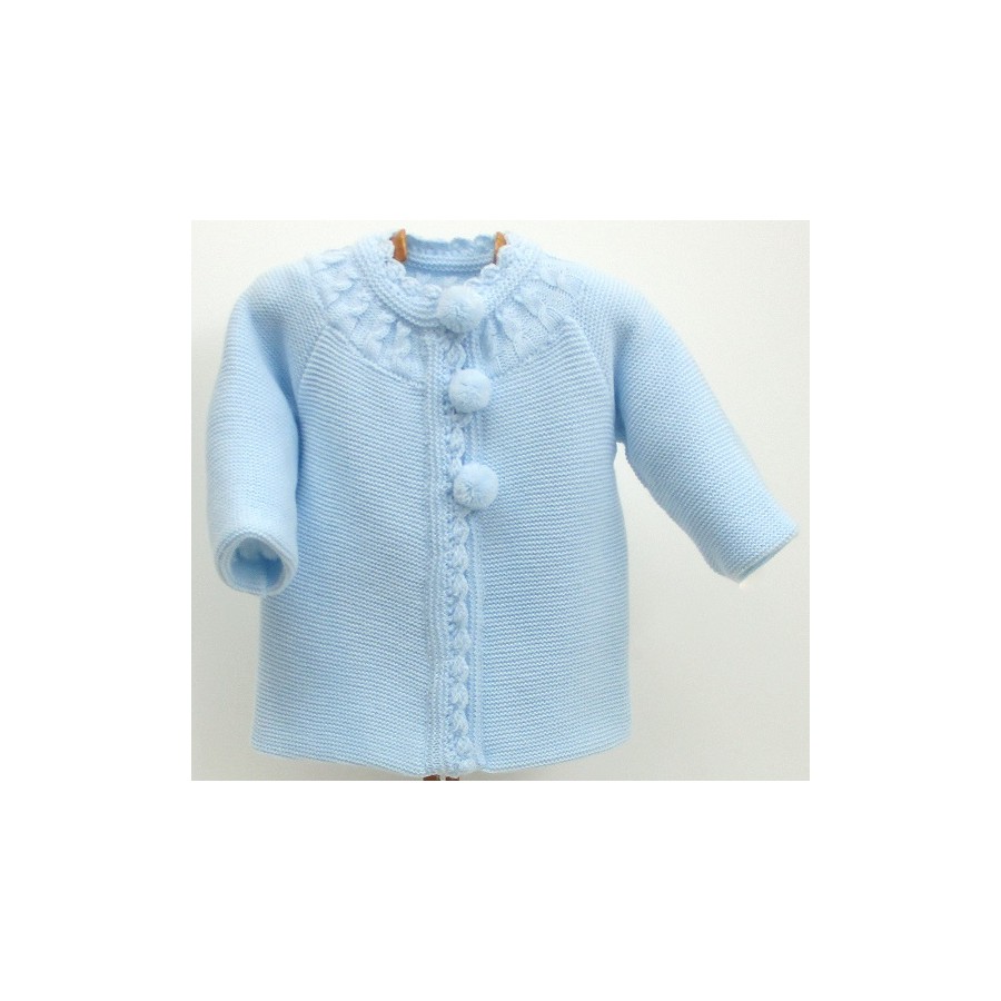 Abrigo de punto, de doble capa, lleva tejido liso y en pechera de ochos y pompones, colores pastel y tallas hasta 24 meses.