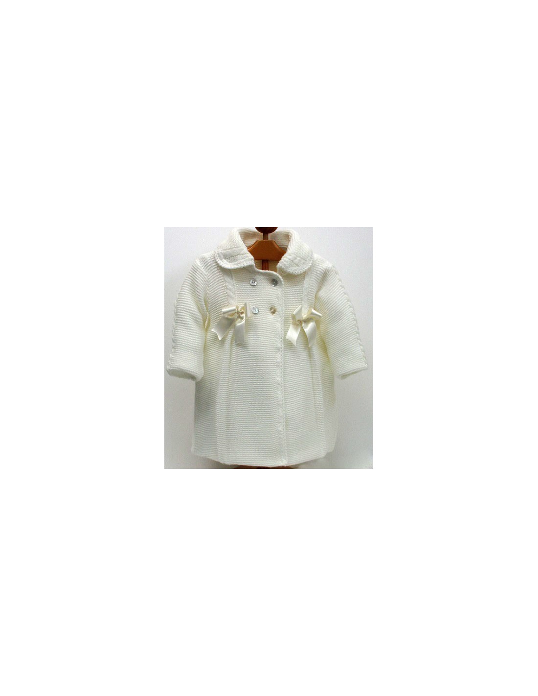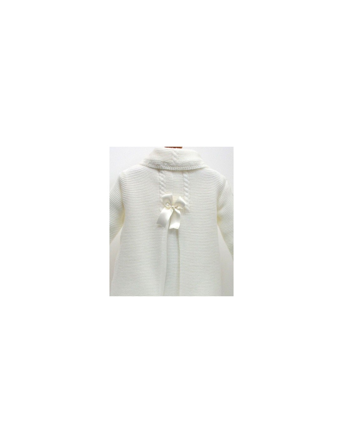 Abrigo de doble capa y de punto bobo, lleva dos pliegues en la pechera y uno en la parte posterior y con lazos en pechera y por detrás a juego,