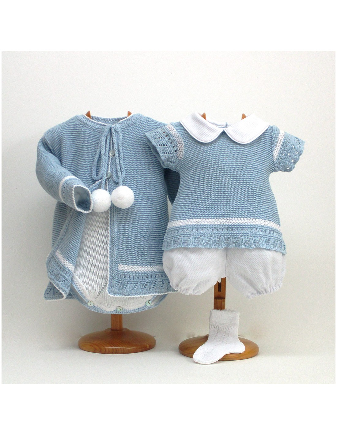 Abrigo, con jersey, pololo y calcetín, con decoraciones y telas en color blanco.