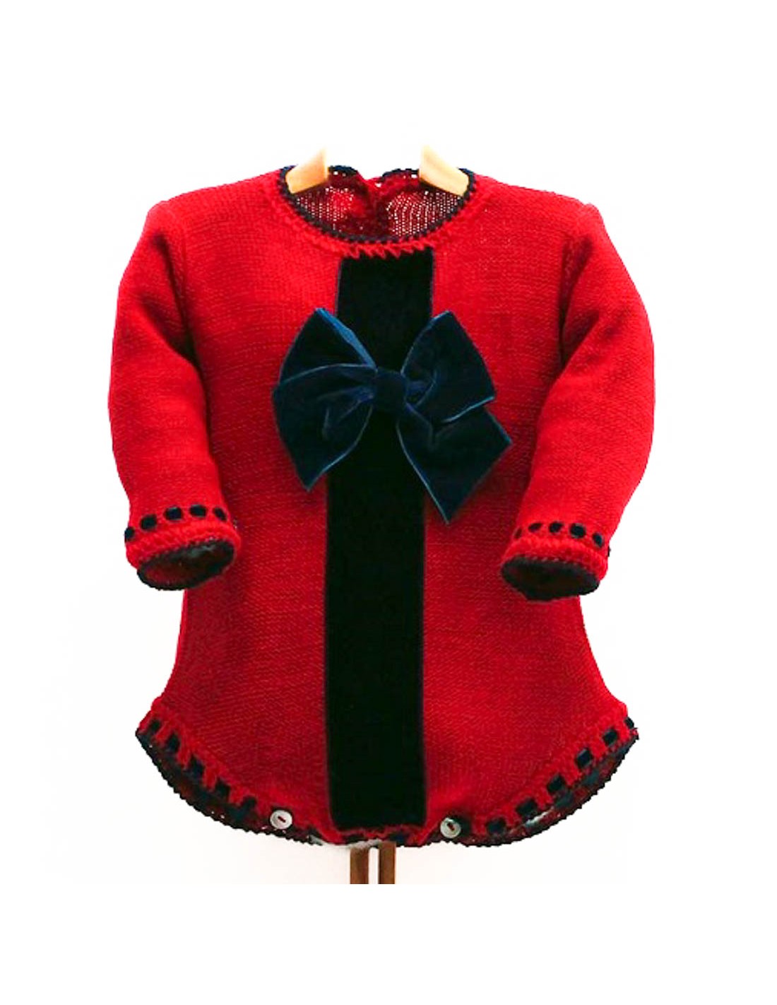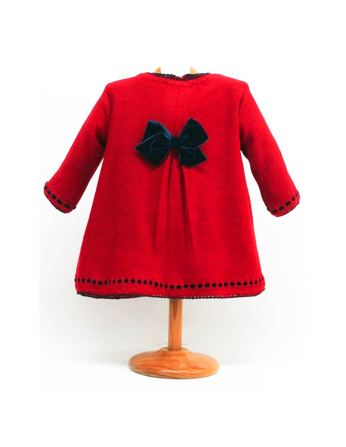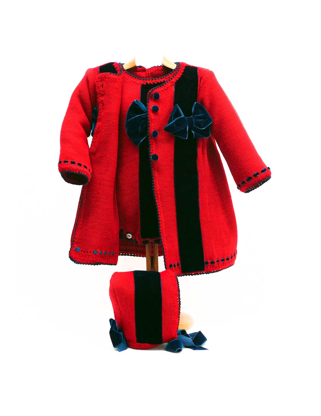 Abrigo de punto en colores rojo, marino, gris o camel, con lazada de terciopelo en color rojo o marino, combinado (marino/rojo, rojo/marino, gris/rojo, camel/marino). Con pelele y capota a juego.