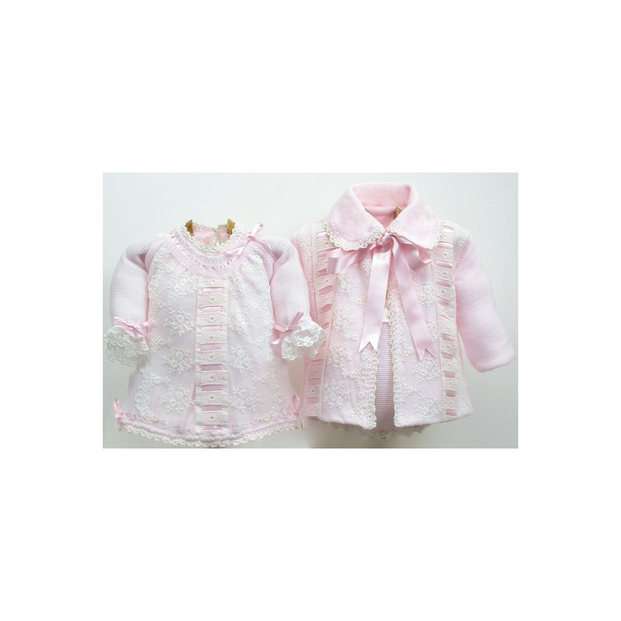 Abrigo de punto bobo, de doble capa, en varios colores pastel, lazos mismo color con pasa cintas y encajes de tul bordado en crudo. Vestido de manga larga a juego.