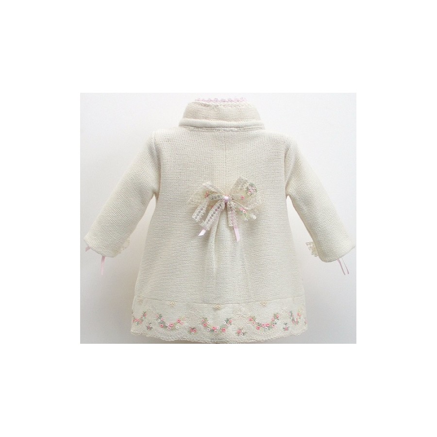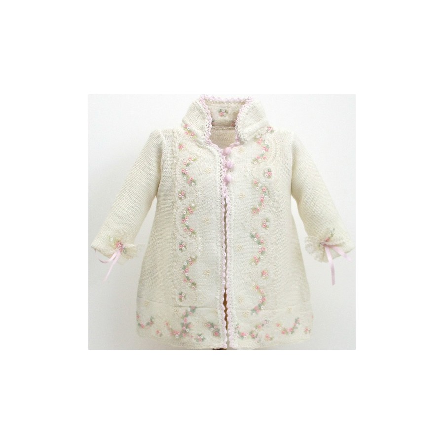 Abrigo de doble capa, cuello Mao, en colores crudo, rosa o celeste, con encajes de tul bordado en rosa o celeste.