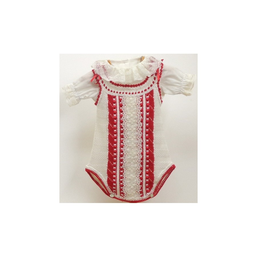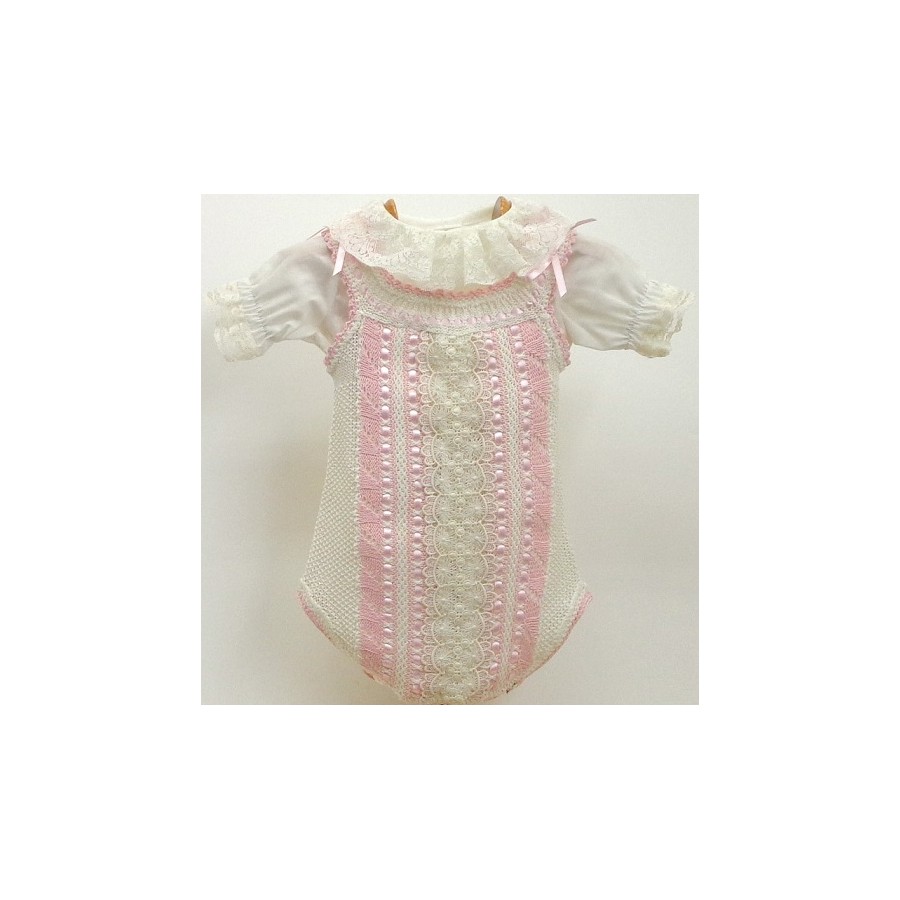 Body de punto con el frontal de guipur y pasacintas. Puede ir combinado en crudo o blanco con distintos colores de bebé. Lleva una camisa de batista de manga corta a juego en blanco o crud, según sea el color que combine.