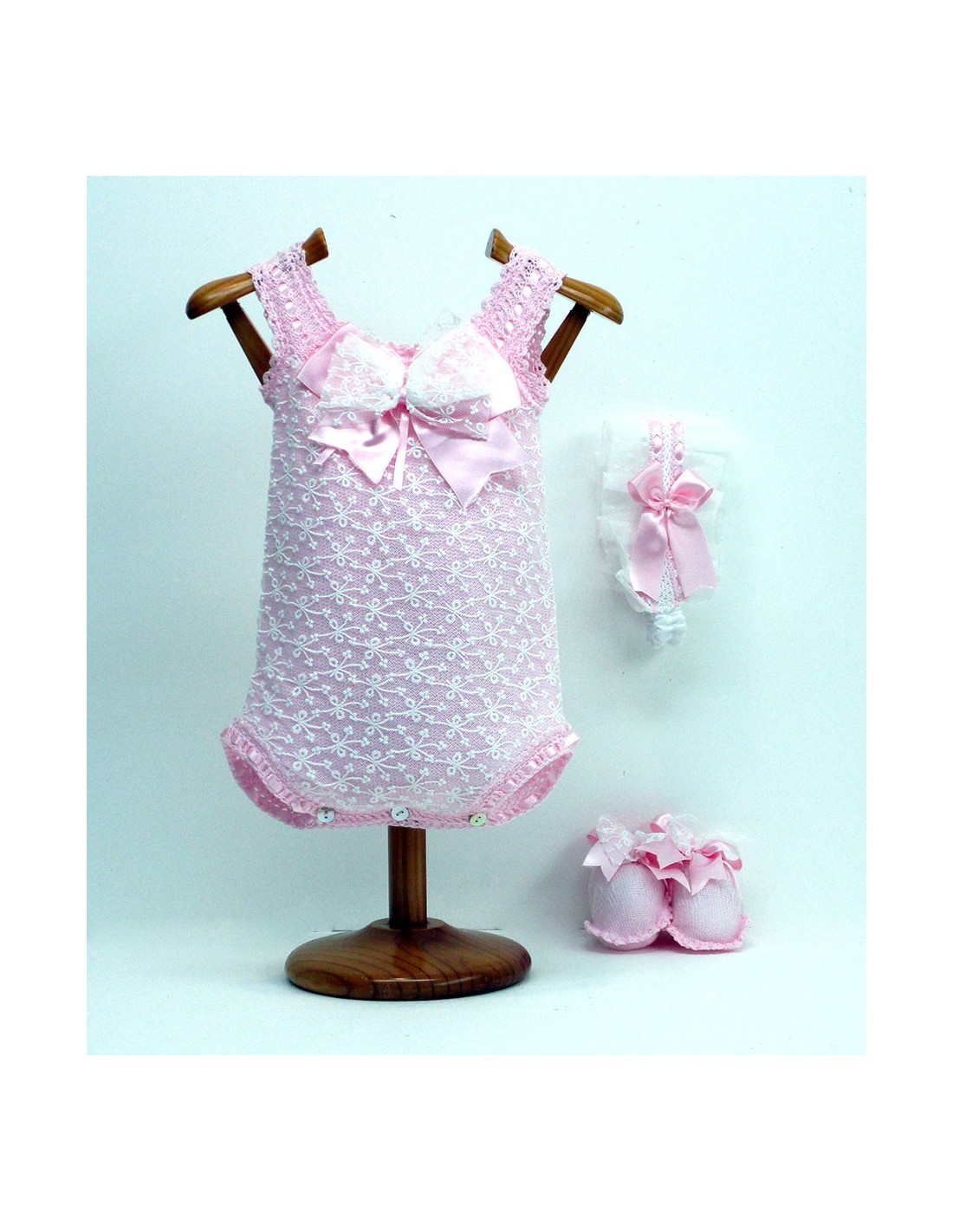Primera puesta de body, diadema y patucos, de hilo, tejido de punto en colores pastel, encajes de tul bordado en crudo claro.
