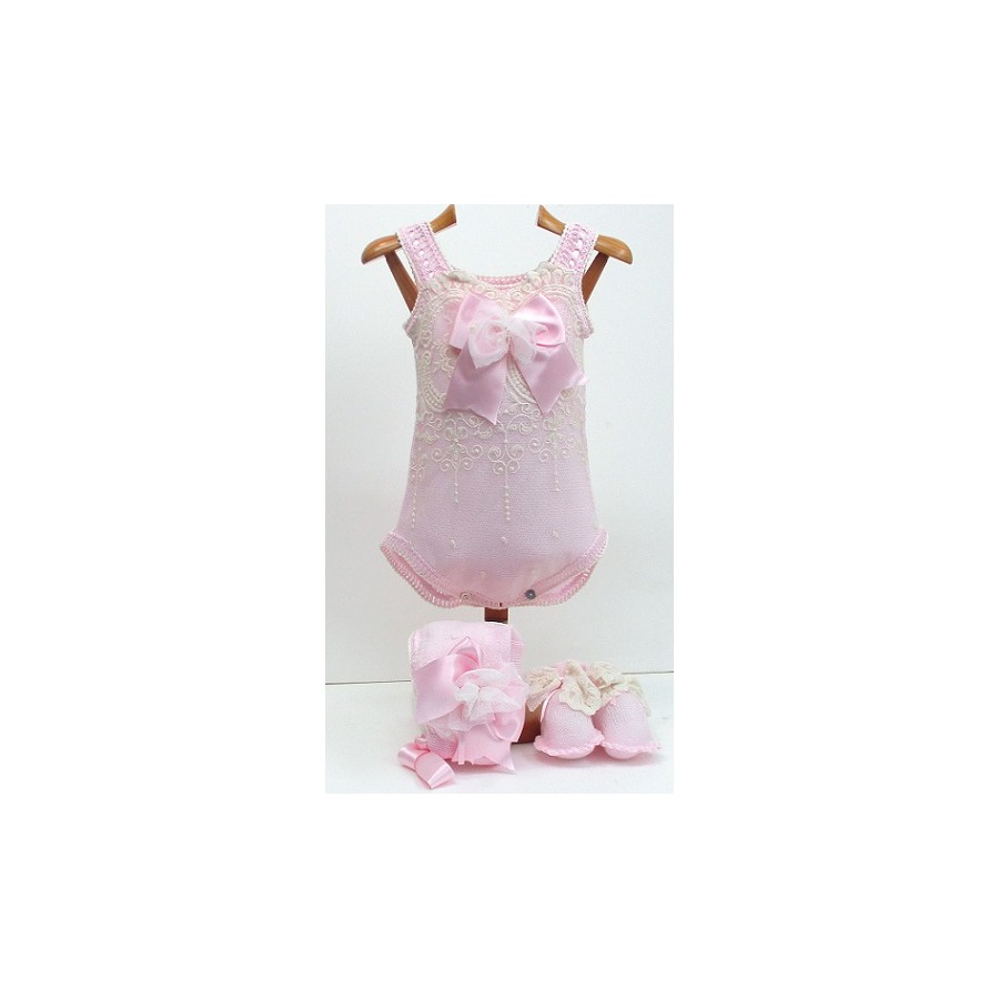 Body de hilo, punto liso, en colores pastel y con encajes de tul bordado en crudo, con patucos y capota a juego.