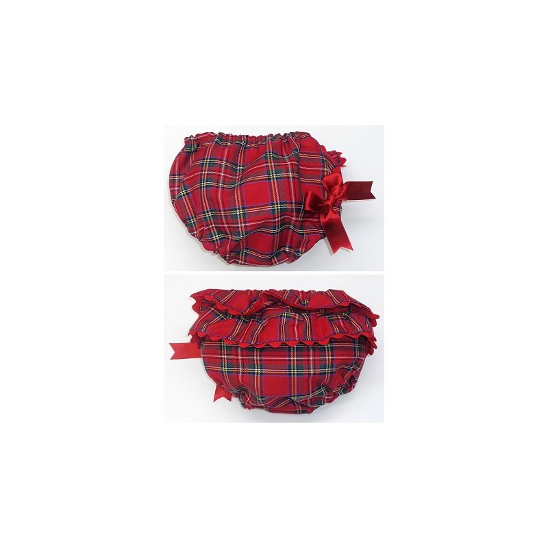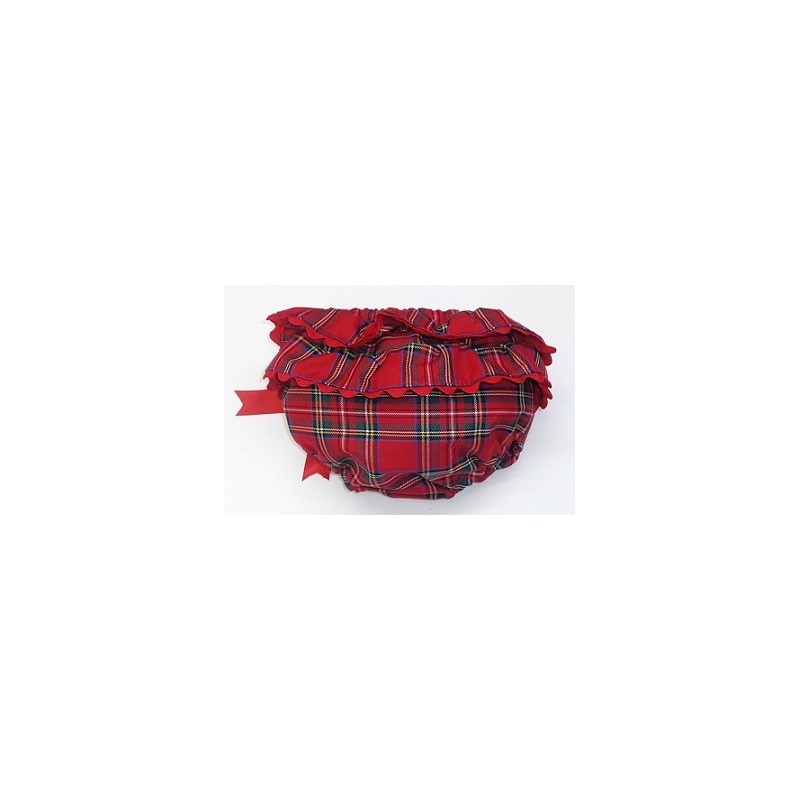 Braga de tela de cuadros escoceses en rojo, con volantes y lazo. Color único.