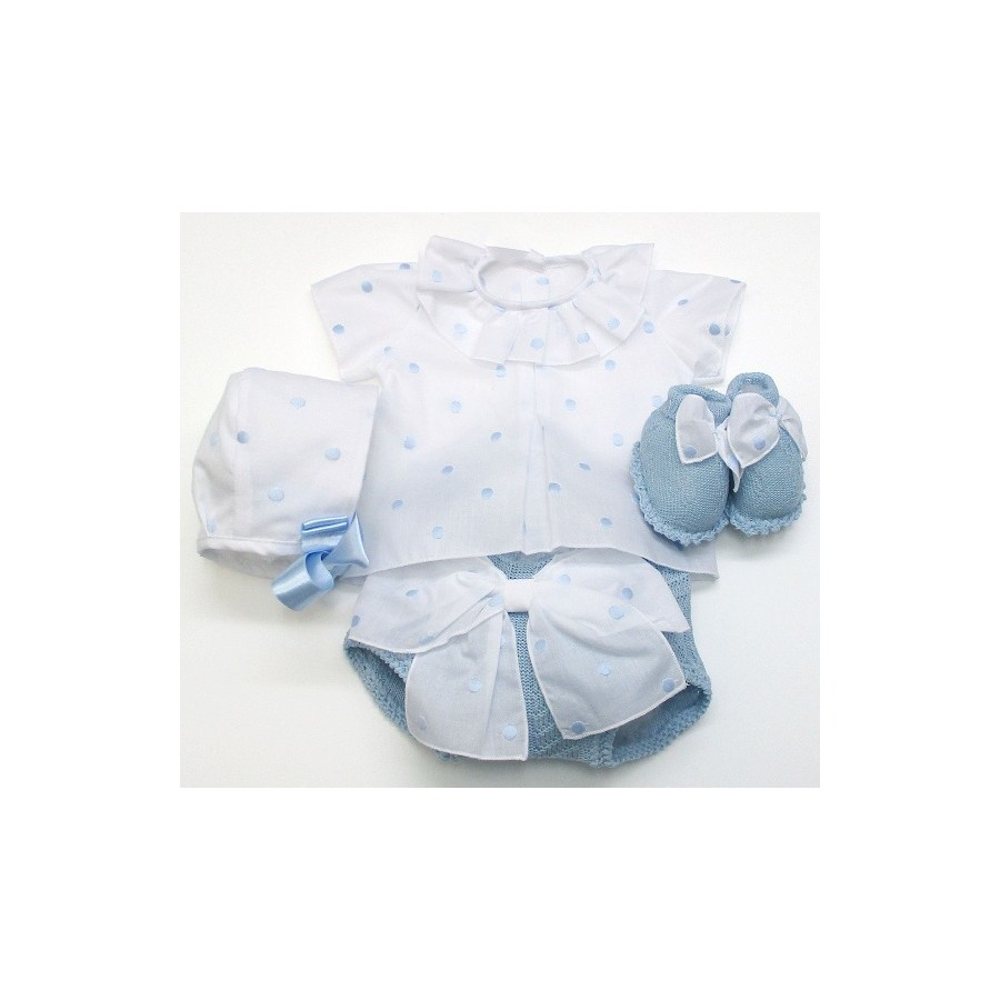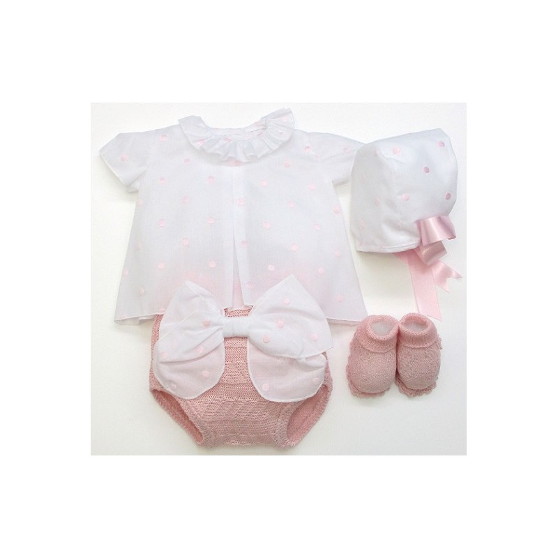 Camisa de manga corta de topìtos, con braga de punto y lazada, capota y patucos a juego, la tela en colores blanco o crudo y el tejido de punto en un segundo color pastel.