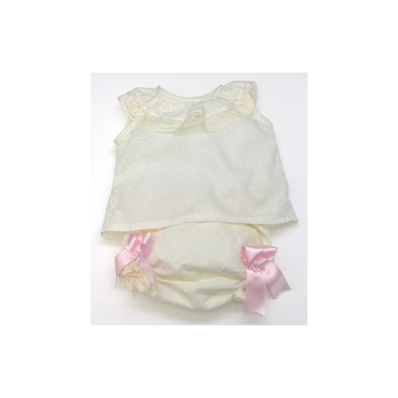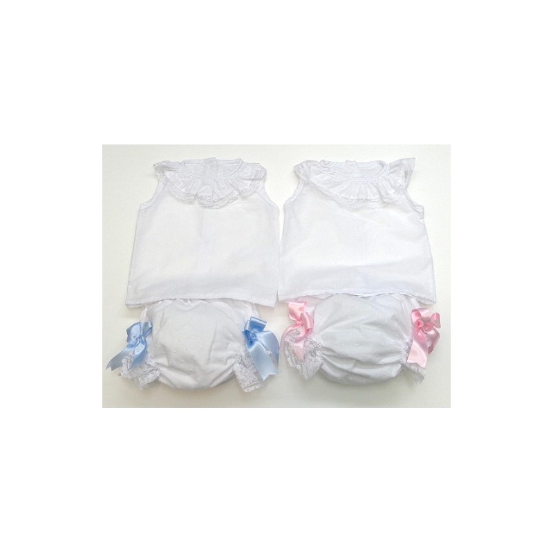 Camisa sin manga y braga de plumeti con encajes, en colores blanco o crudo,  con lazos en rosa, celeste o crudo y como segundo color de la combinación.