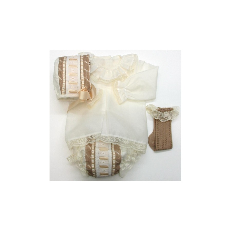 Conjunto de plumeti: camisa lisa de manga larga, braga y capota, con decoraciones de punto y lazos, con calcetines a juego. El plumeti en blanco o crudo y los detalles a un segundo color combinado.
