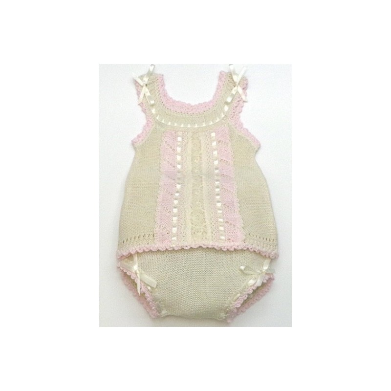 Camiseta y braga en colores blanco o crudo y con encajes del mismo color, con lazos, apliques y ganchillo artesanal en rosa o celeste.