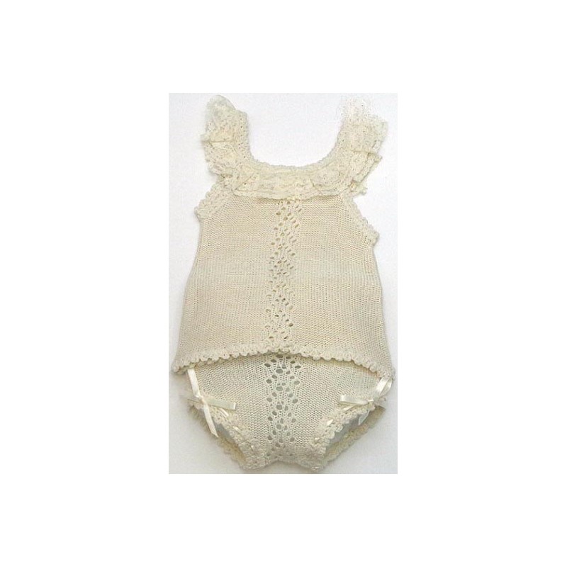 Camiseta y braga, con calados, encajes en crudo o blanco, lazos a tono.