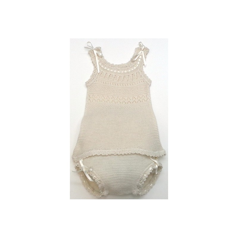 Camiseta y braga, con dibujos calados, lazos en crudo o blanco.