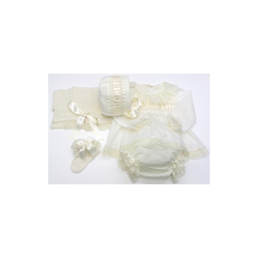 Conjunto para bebé formado por camisola de manga larga y braga de plumeti, y capota con el exterior de punto y forrada de plumeti, chaqueta y calcetin a juego.