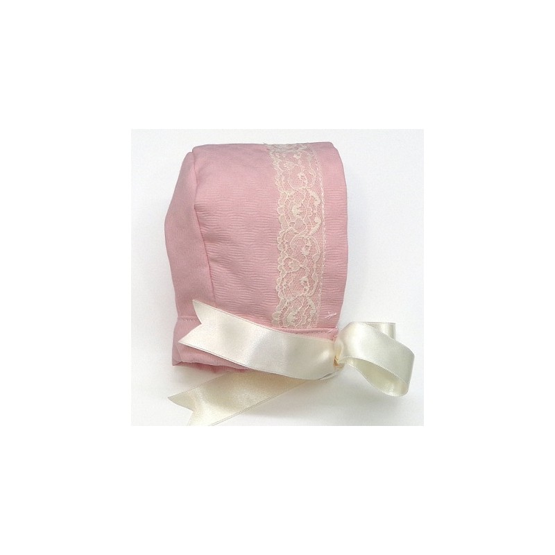 Capota de piqué labrado en colores rosa, celeste, camel y verde agua, encajes en color crudo.