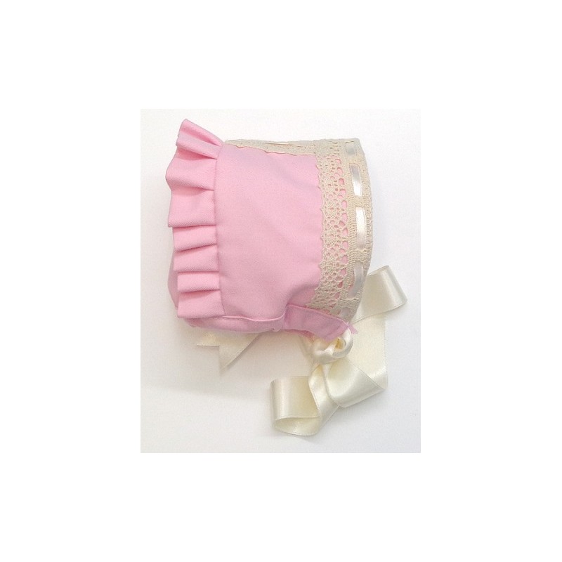 Capota de viyela en colores rosa o celeste, con encajes y lazos en crudo.