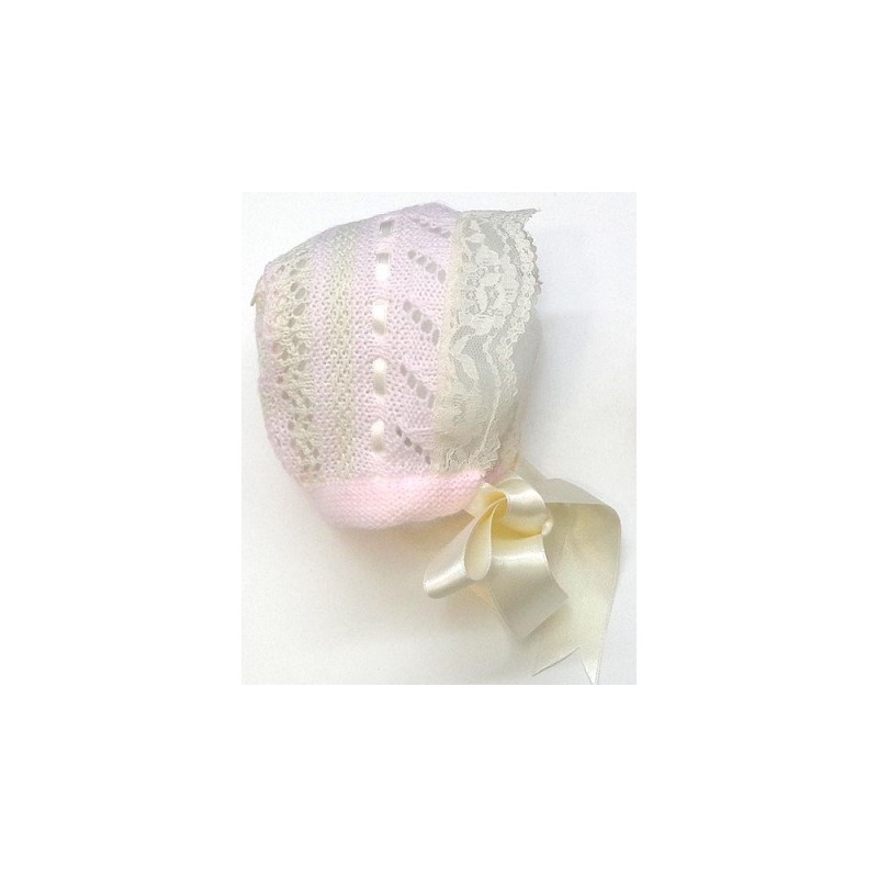 Capota en colores rosa o celeste combinado con crudo, encajes y lazos en crudo.