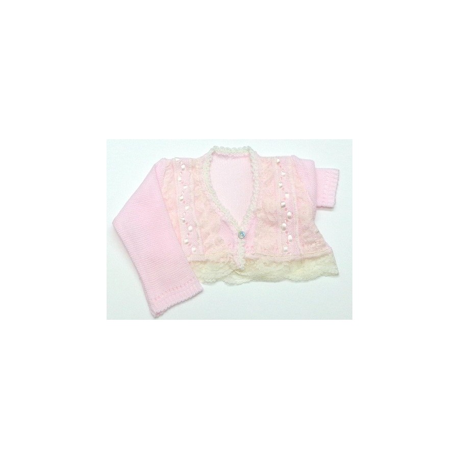Chaqueta con encajes acrílicos y lazos entre tejidos, en tonos rosa o celeste combinados con encajes y lazos en crudo o en blanco.Varias tallas a elegir.