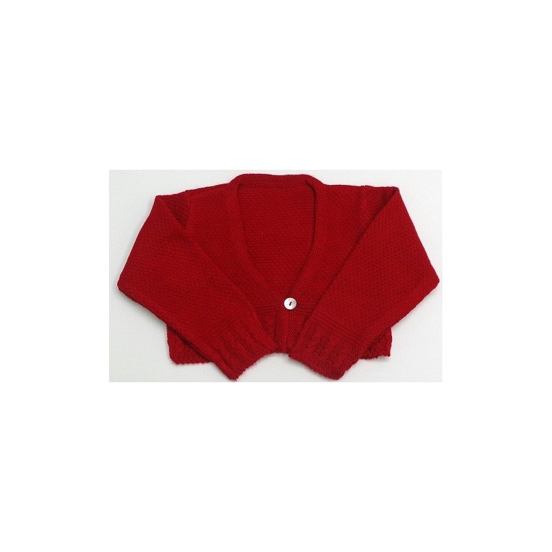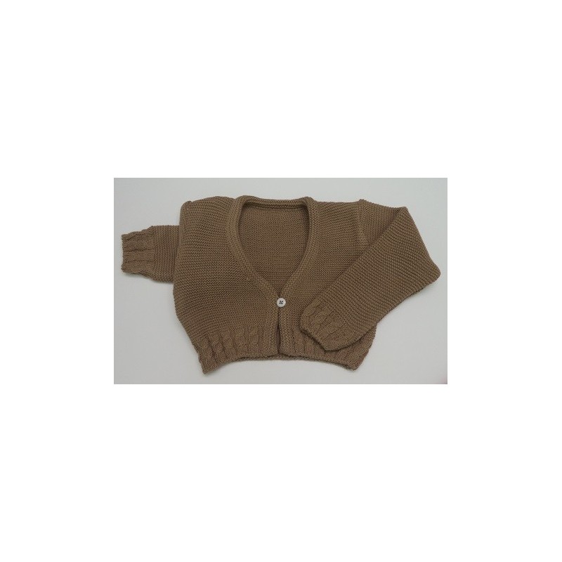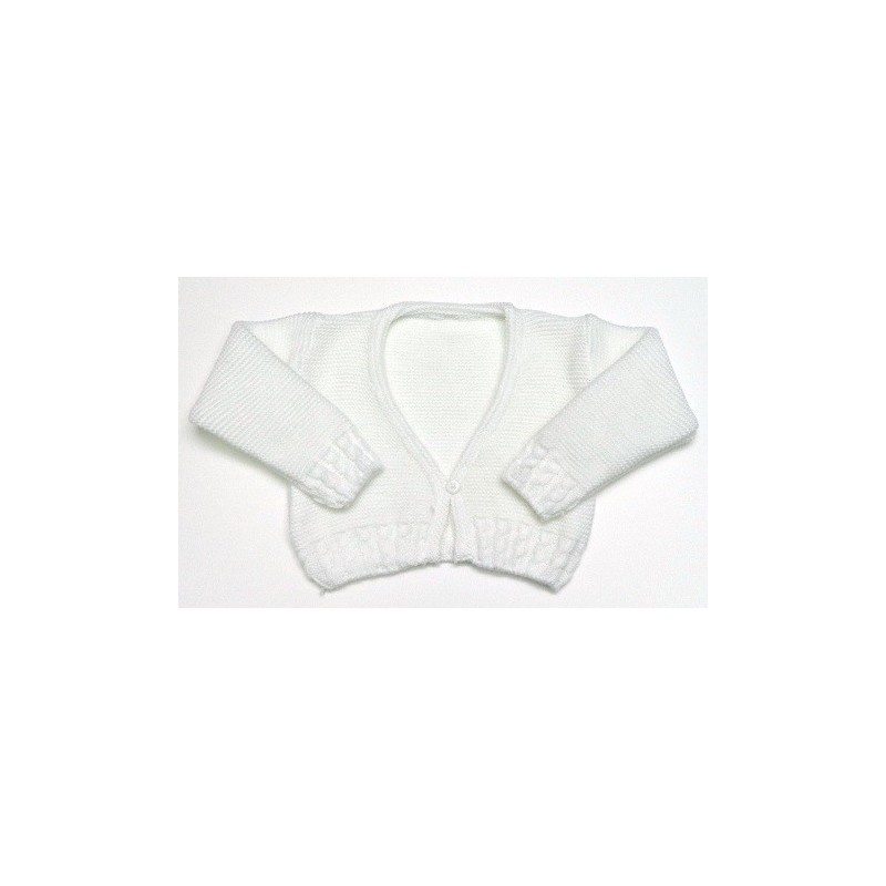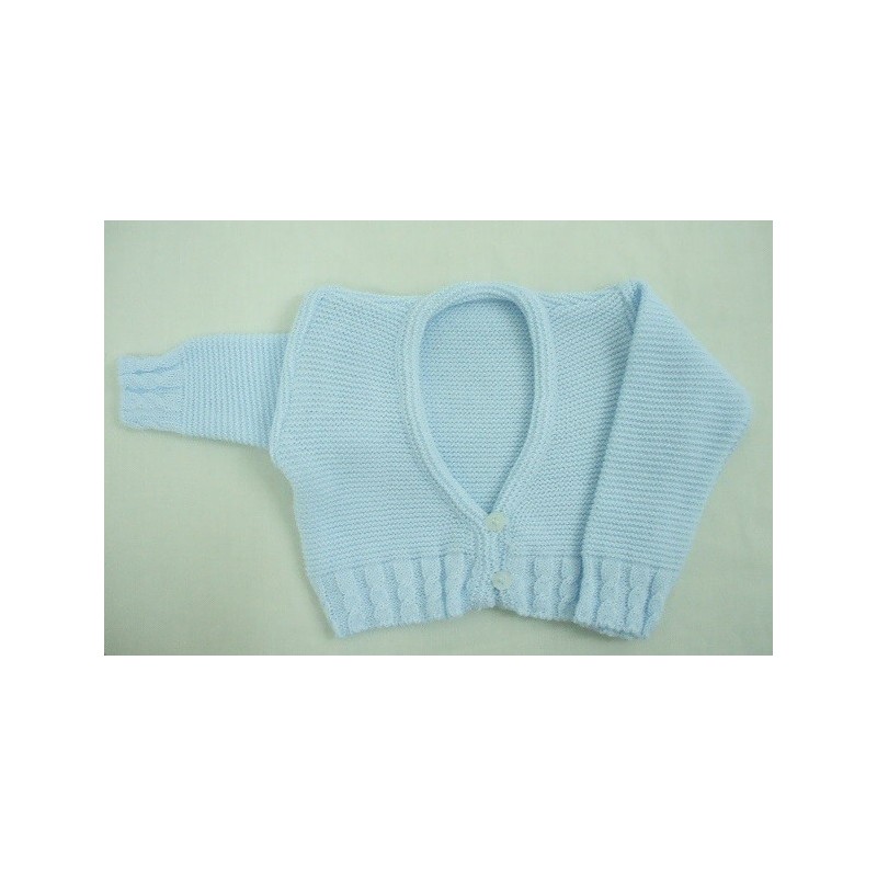 Chaqueta de cuello en pico, tejida en punto bobo y terminada con ochos. Esa terminación con ochos en los puños y en el bajo hace que sea un poquitín entallada, y sienta muy bien con vestidos o con peleles. Al llevar el cuello de pico, es más apropiada para prendas de una sola pieza. Para conjuntos de dos piezas (camisa y braga), siempre será mejor una chaqueta con cuello redondo.