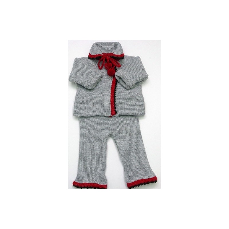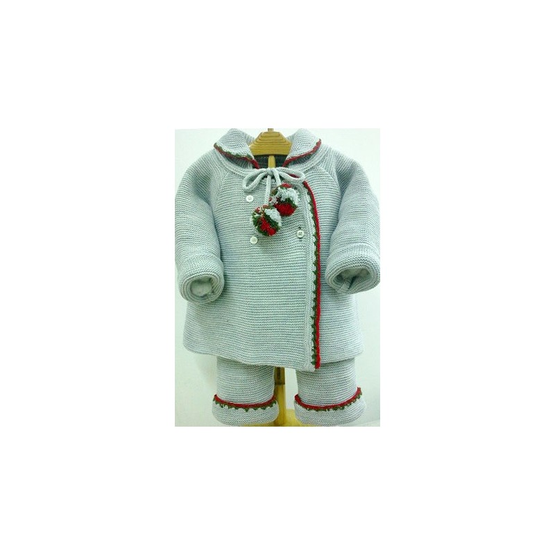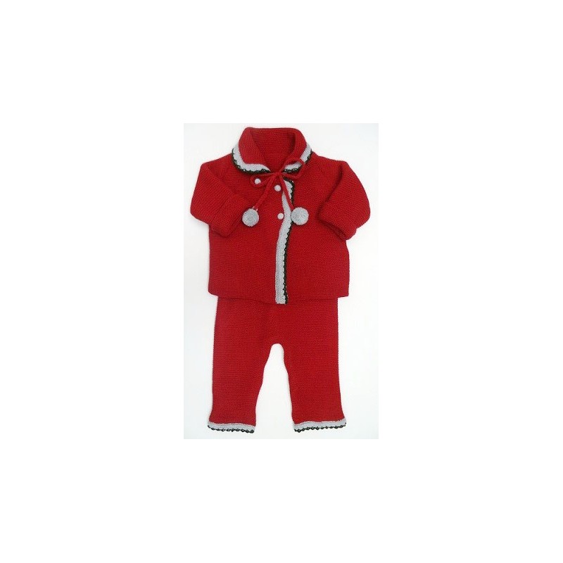 Conjunto de bebé de chaquetón y pantalón dobles de punto bobo. Rematado con un remate de ganchillo y pompones, combinando el rojo, el verde y el gris.