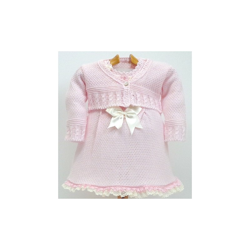 Conjunto de vestido, braguita y chaqueta a juego, en colores rosa o celeste con encajes y lazos en crudo.