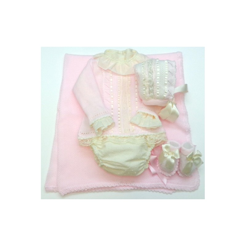 Conjunto de jersey, camisa ml, braga, capota, patucos y toquilla, el tejido en varios colores, la camisa y la braga de plumeti y los lazos y encajes en crudo.