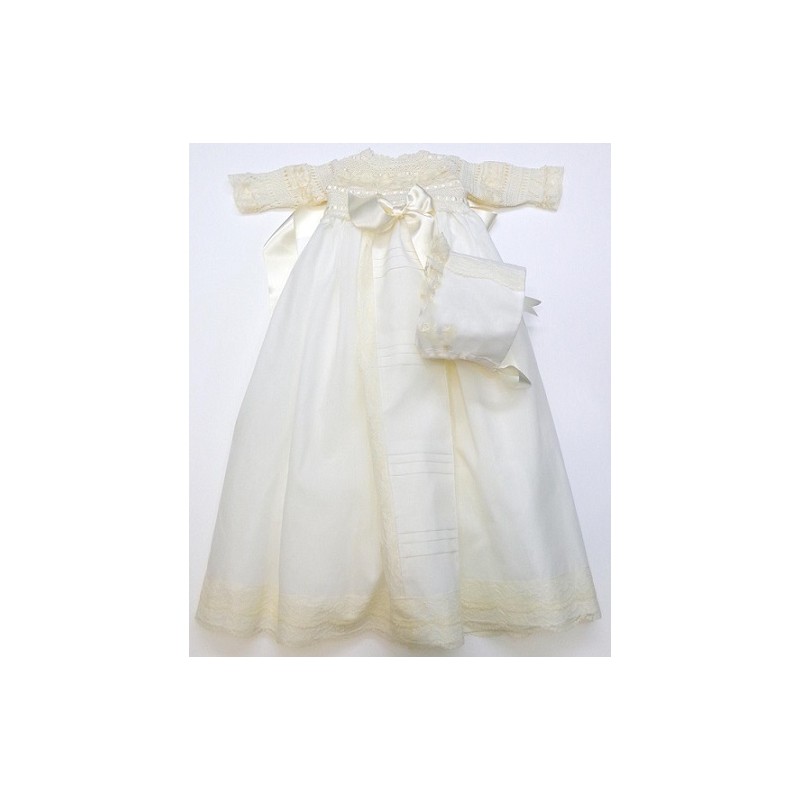 Faldón de bautizo, cuerpo de punto de manga larga, parte inferior de batista y forrado y con encajes y lazos del mismo color. En blanco o en crudo. Capota a juego.