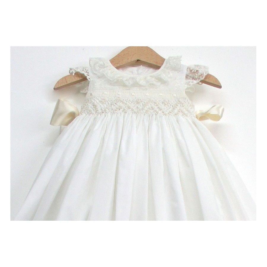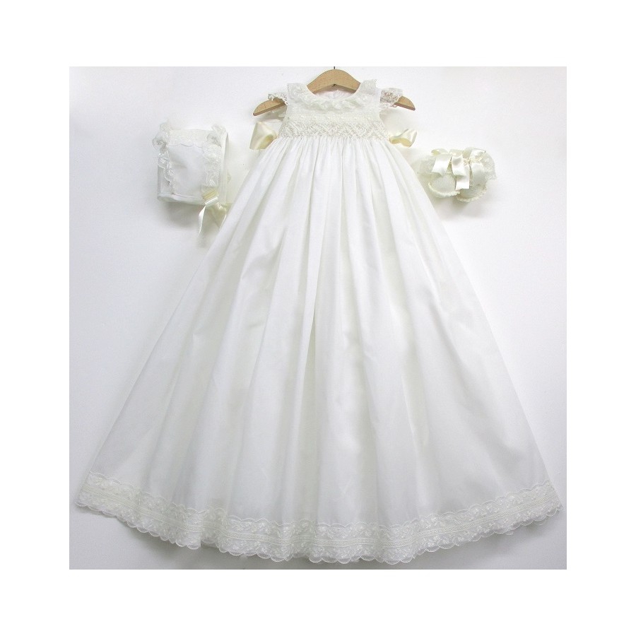 Faldón de bautizo de cuerpo de punto ruso y parte inferior de batista, sin manga y con forro también de batista y encajes de tul bordado, lazos y volantes del mismo color, con capota y patucos. En blanco o en crudo. T.1M para 4 kg// T.3M para 5,5kg// T.6M para 7 kg// T.9M para 8 kg// T.12M para 9,5kg//