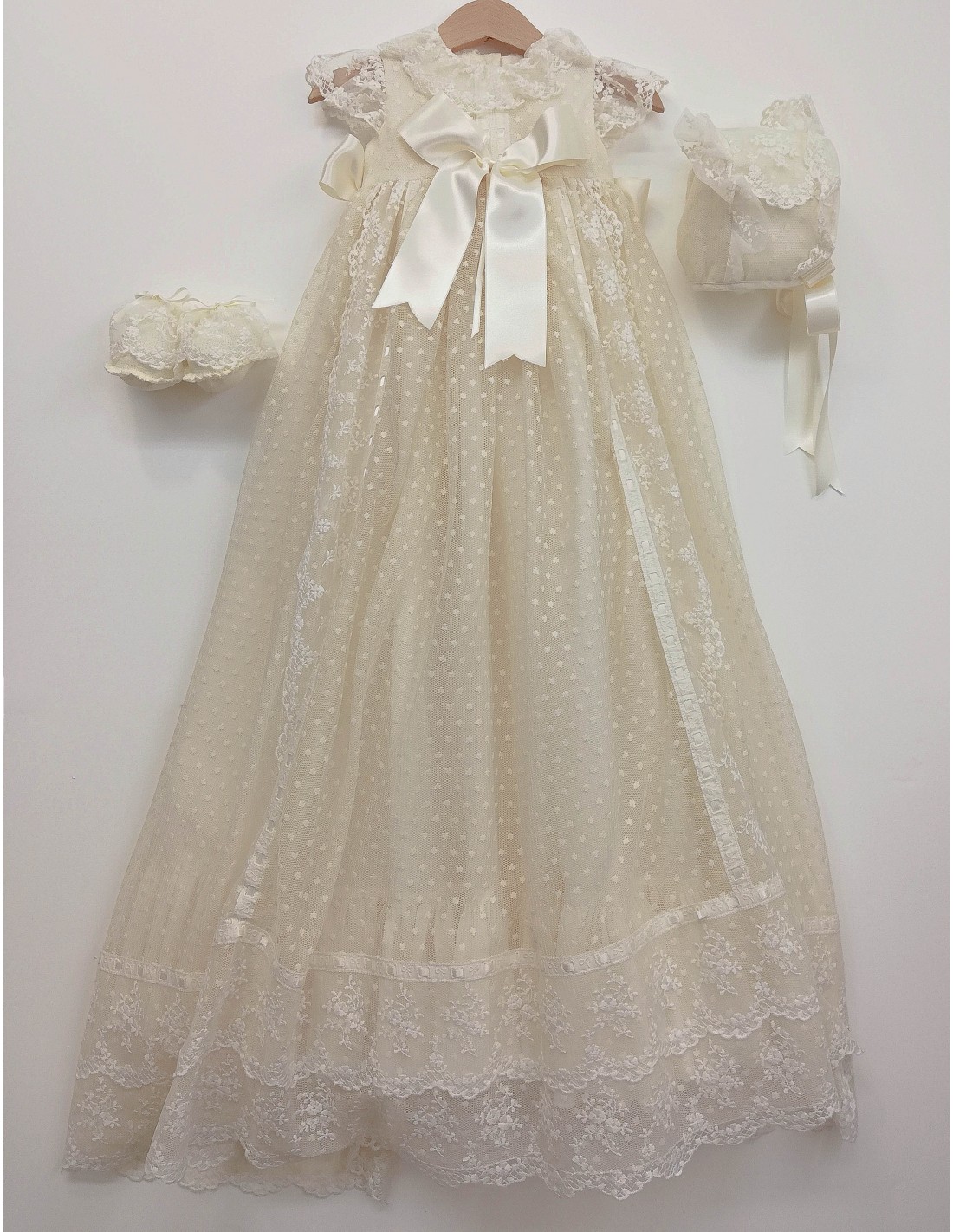 Faldón de bautizo de batista organdizada y plumeti bordado, color crudo y lazadas del mismo color, tallas desde 3 hasta 18 meses.