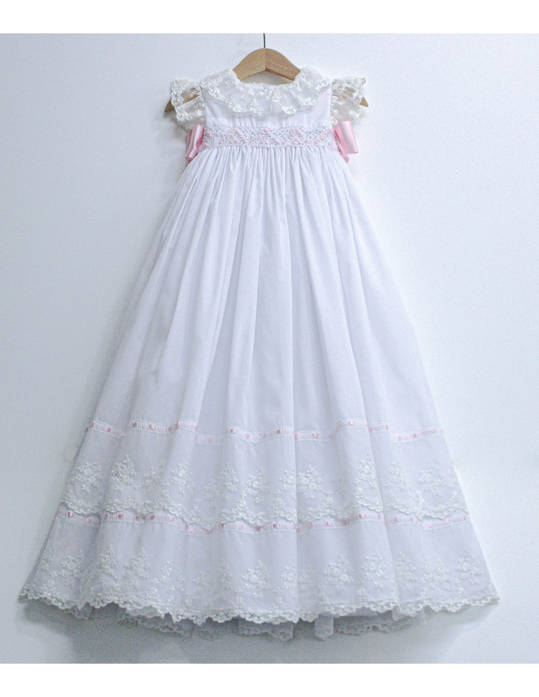 Faldón de bautizo de batista organdizada y tul bordado, con bordados de punto ruso, color blanco con lazos y lazadas en rosa bebé, tallas desde 3 hasta 18 meses.