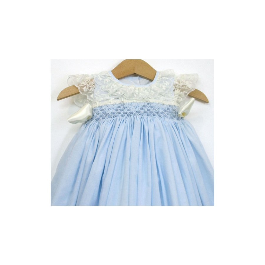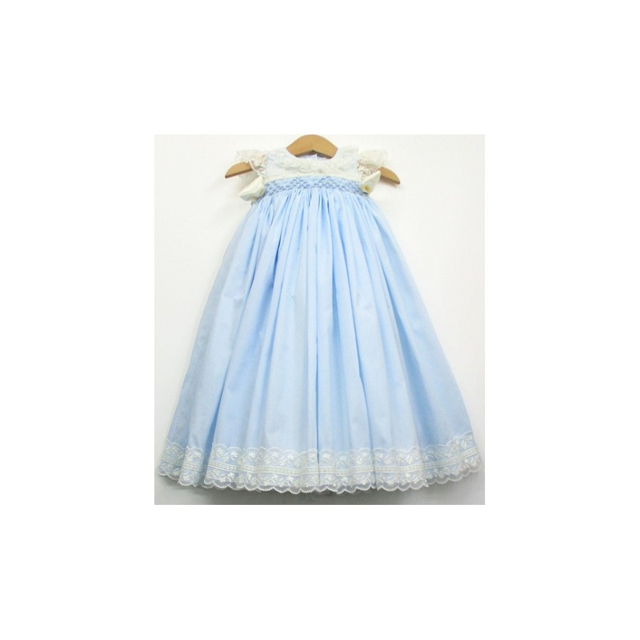 Va bordado en la pechera con punto smock, al tono de la tela. Lleva volantes de guipur en el cuello y las sisas.