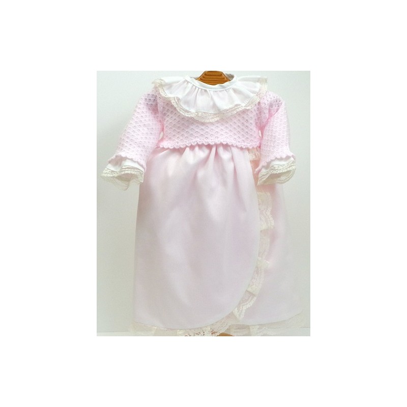 Faldón de popelín forrado de batista, camisa de batista, el jersey de punto y faldón en colores rosa, celeste, blanco o crudo, la camisa y encajes en blanco o en crudo.