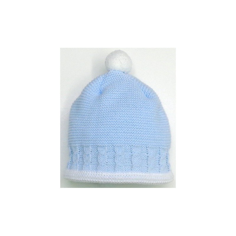 Gorro de punto bobo y ochos, terminado en lista y pompón a color combinado.