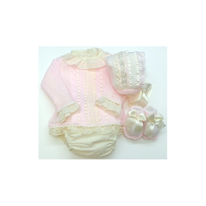 Conjunto de jersey, camisa ml, braga, capota y patucos, el tejido en varios colores, la camisa y la braga de plumeti y los lazos y encajes en crudo.