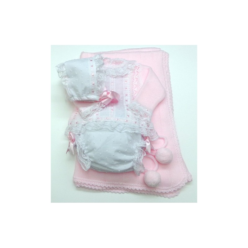 Conjunto de primera puesta formado por jersey, braga, capota y toquilla con pompones, en varios colores pastel, con braga y capota de plumeti, telas y encajes en color crudo o blanco.