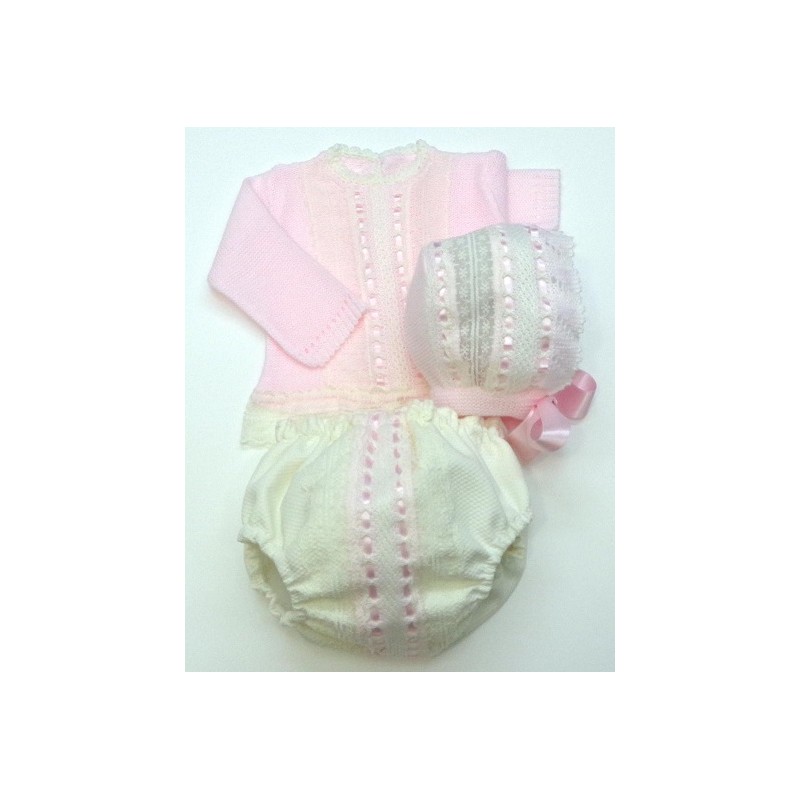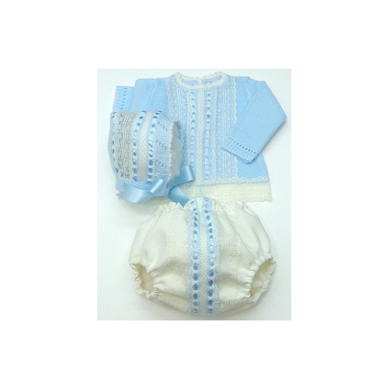 Jersey con lazos entretejidos y encaje, con braga de piqué decorada. El piqué, lazos y encajes en blanco o crudo.