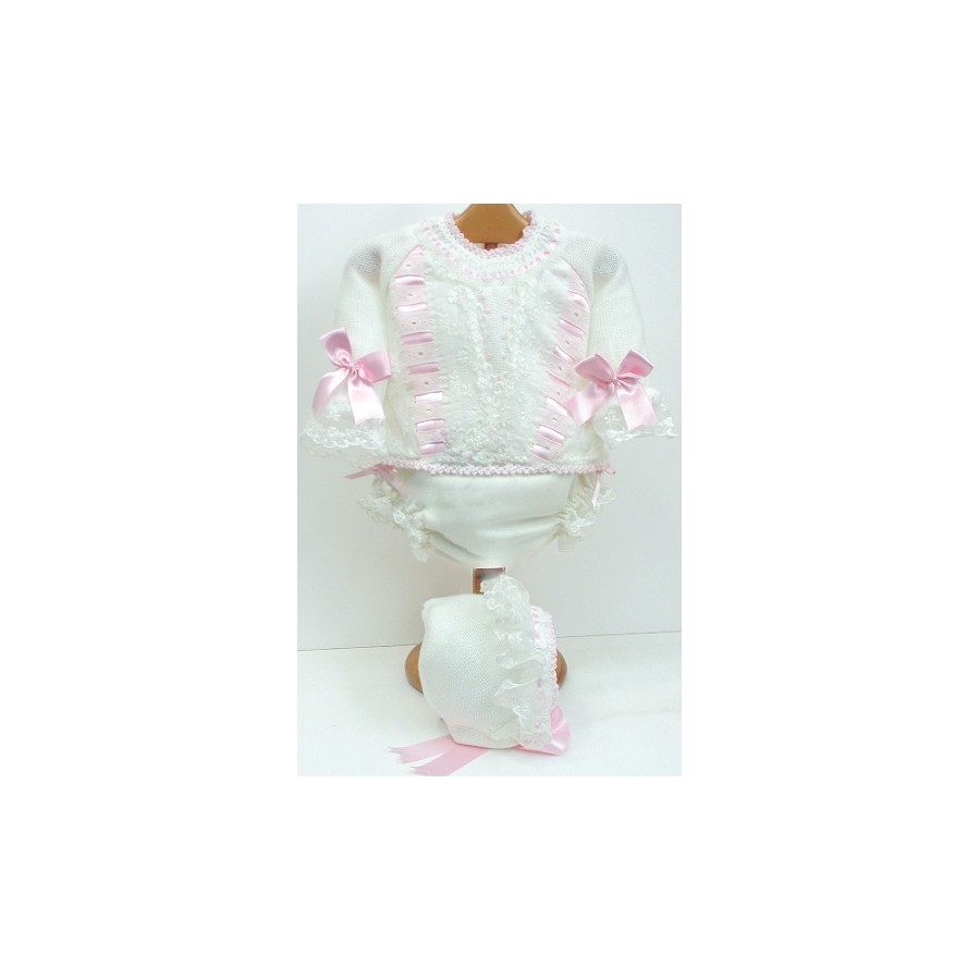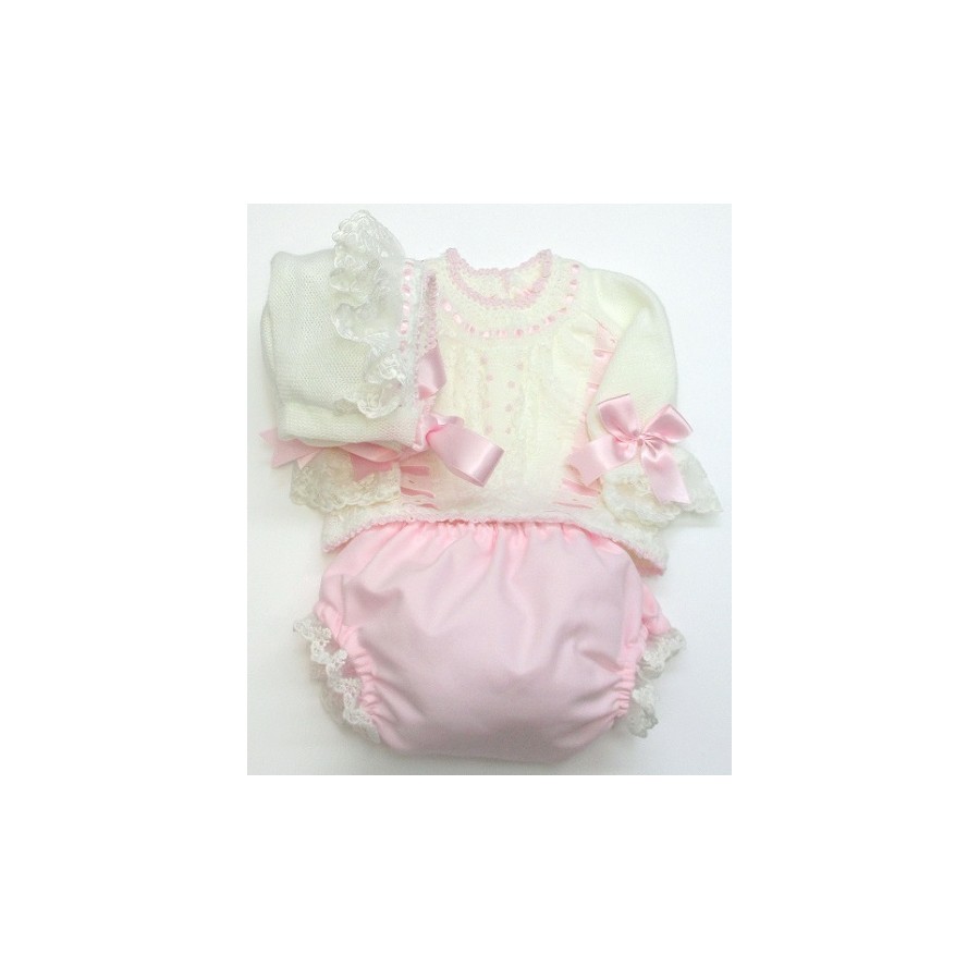 Conjunto de jersey y capota en color crudo lazos en rosa, celeste o crudo, con encajes de tul bordado en crudo y con braga de viyela en rosa, celeste o crudo.