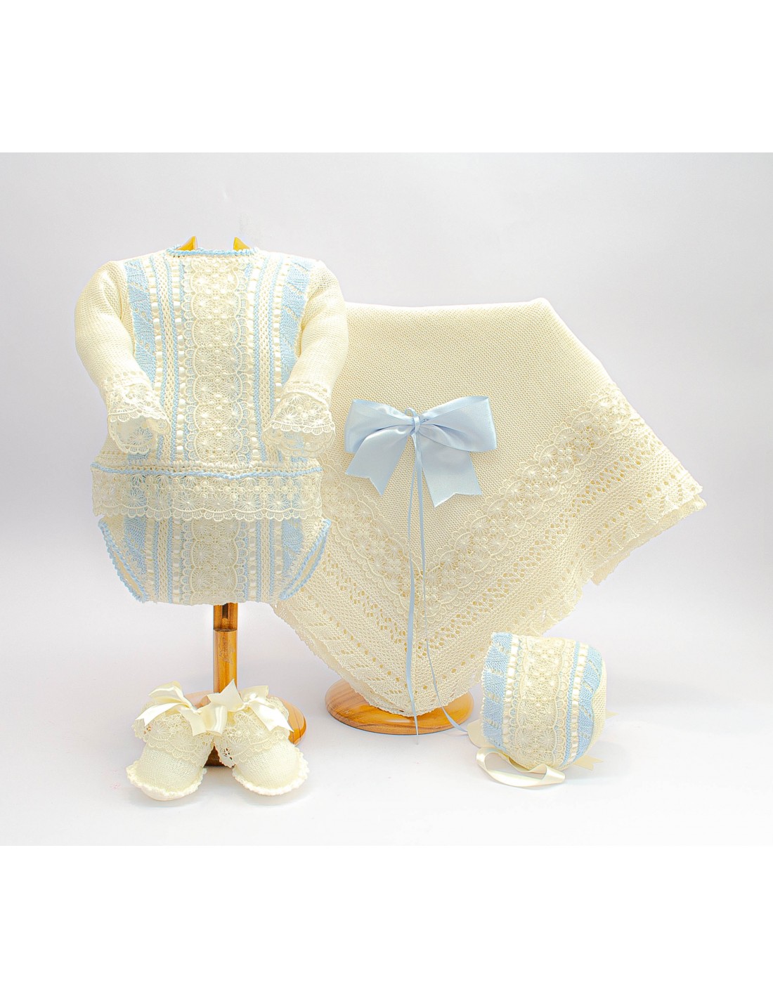 Conjunto de jersey, braga, capota, patucos y toquilla, el tejido de hilo en color crudo, lazada y tejido combinado con rosa, celeste, verde agua o camel.