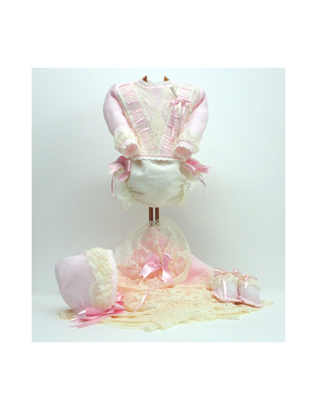 Conjunto de jersey, braga, capota, patucos y toquilla personalizada, el tejido de punto y lazos en varios colores pastel, telas y encajes en crudo.