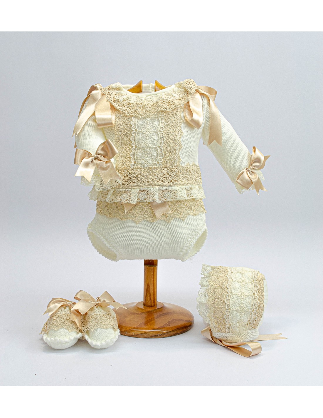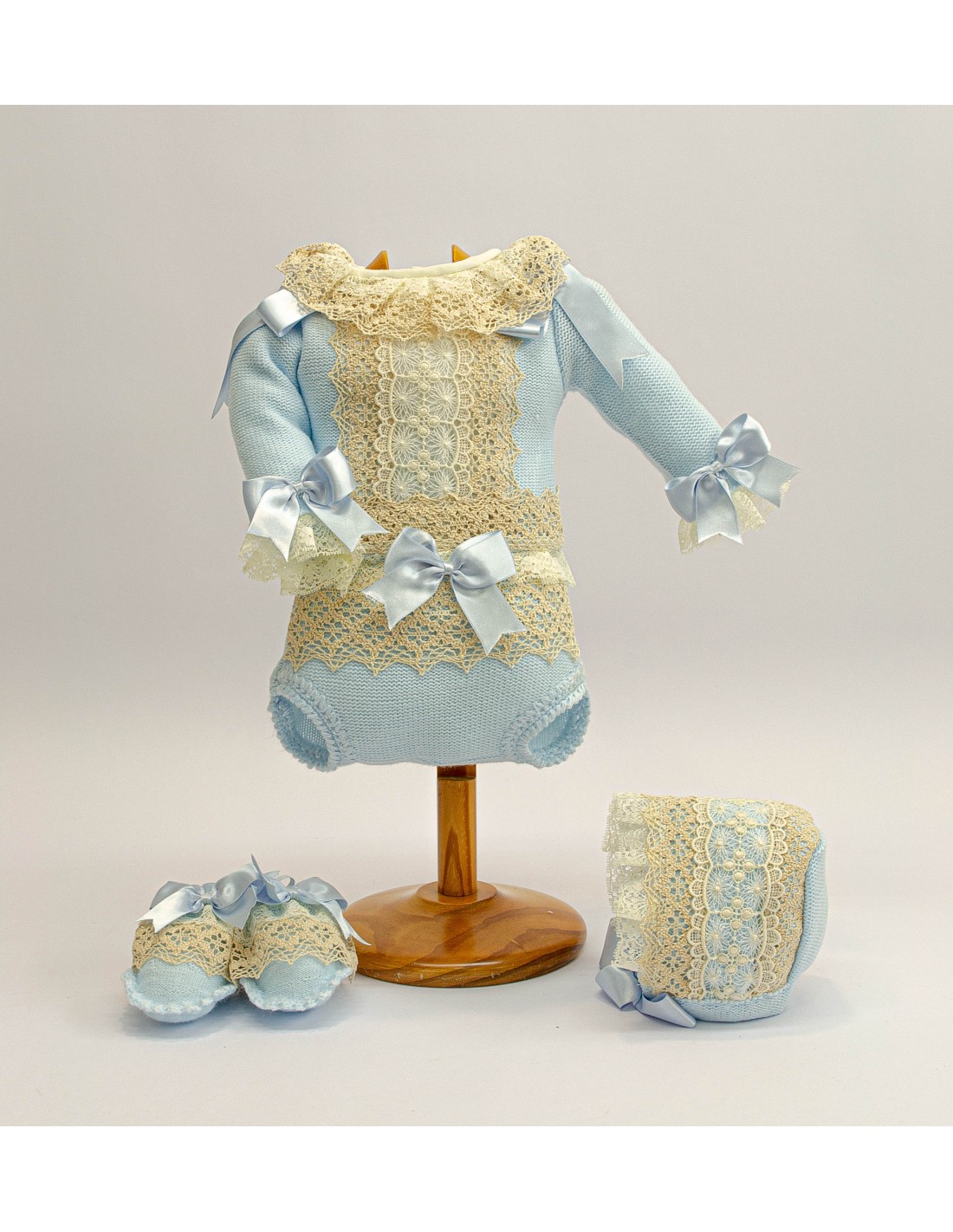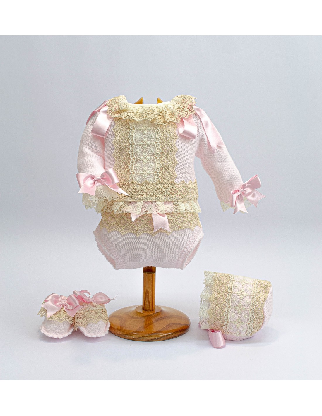 Conjunto de jersey, braga, capota, patucos, en tonos a elegir: rosa bebé, celeste o crudo, lazos a juego, con encajes de hilo en tostado.