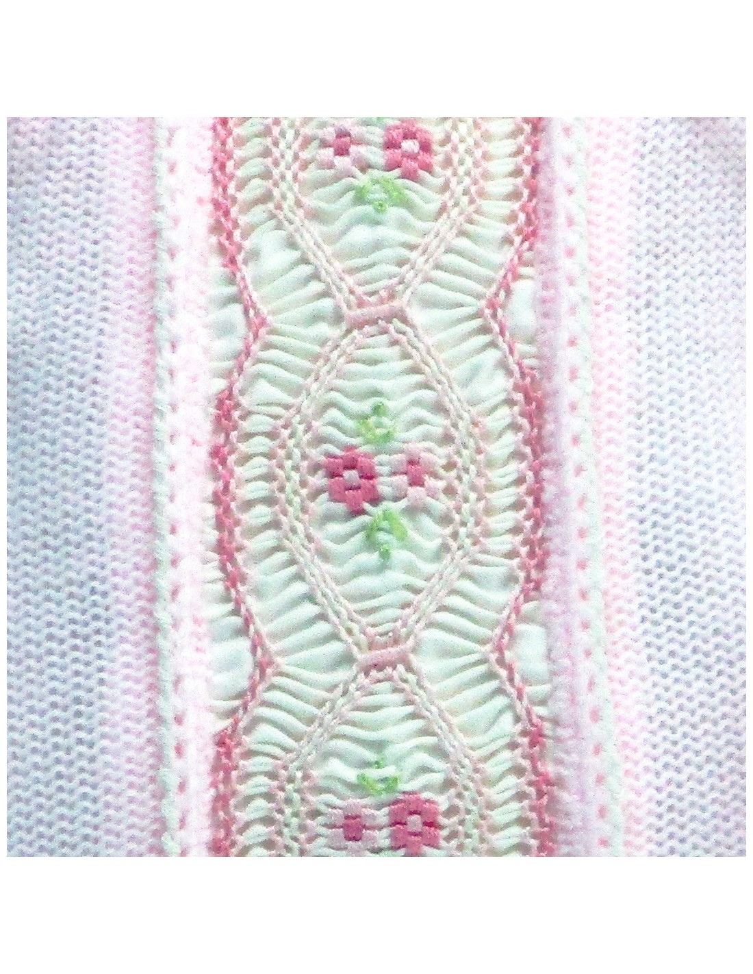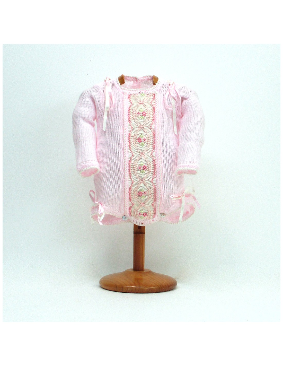 Pelele de punto, con bordados de punto ruso en tonos crudo, rosa o celeste.