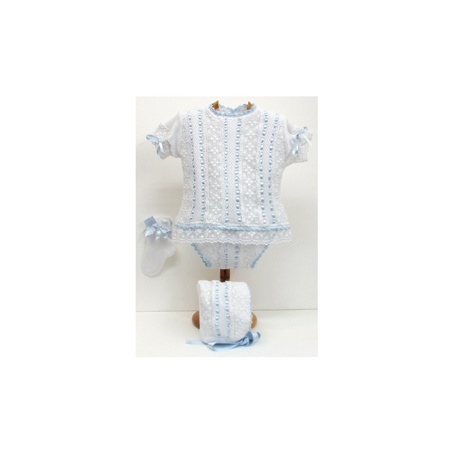 Conjunto de jersey, braga y capota de hilo, el tejido de punto y los encajes de guipur en color blanco y con lazos de pasamanería en colores pastel, calcetín a juego.