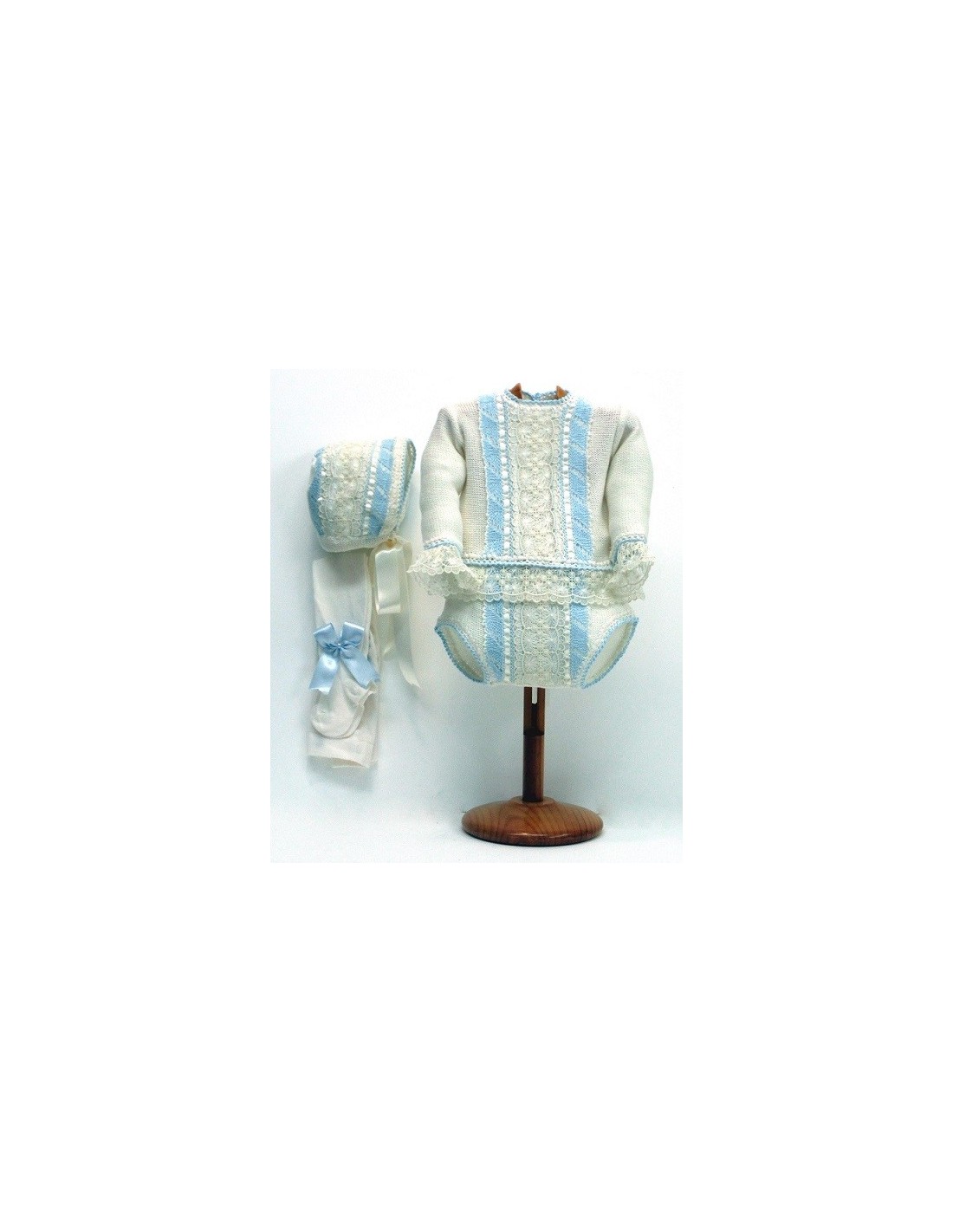 Conjunto de jersey, braga, capota y leotardos, de lana, en color crudo y con decoraciones y lazos en color a elegir.