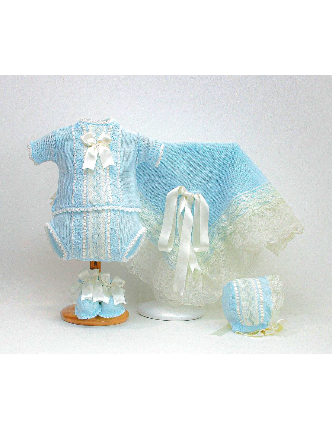 Conjunto de jersey de manga corta, braga, capota, patucos y toquilla, en color pastel a elegir, con lazos de pasamanería y encajes en color crudo. El jersey puede ser de manga corta o manga larga (especificar en el pedido)
