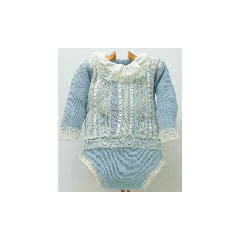 Jersey con calados formando dibujo, en varios colores y tallas a elegir, con encajes artesanales de puntillas y lazos colocados verticalmente en el canesú, estos en color crudo. Braga a juego.