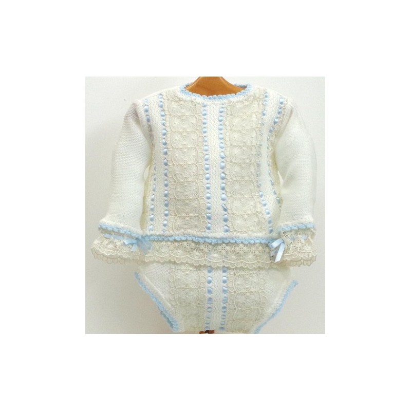 Jersey+braga con encajes de guipure, el tejido de punto y encajes en crudo, lazos en color a elegir.